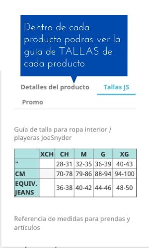 Dentro de cada producto hay una tabla de tallas por marca que te ayudara a identificar la talla correcta